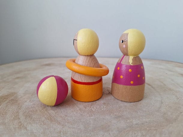 Deze set bestaat uit 2 strandgangers van ca. 60mm met zwemband en strandbal